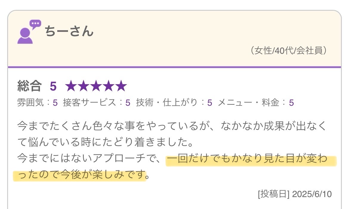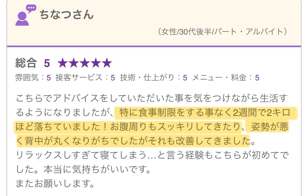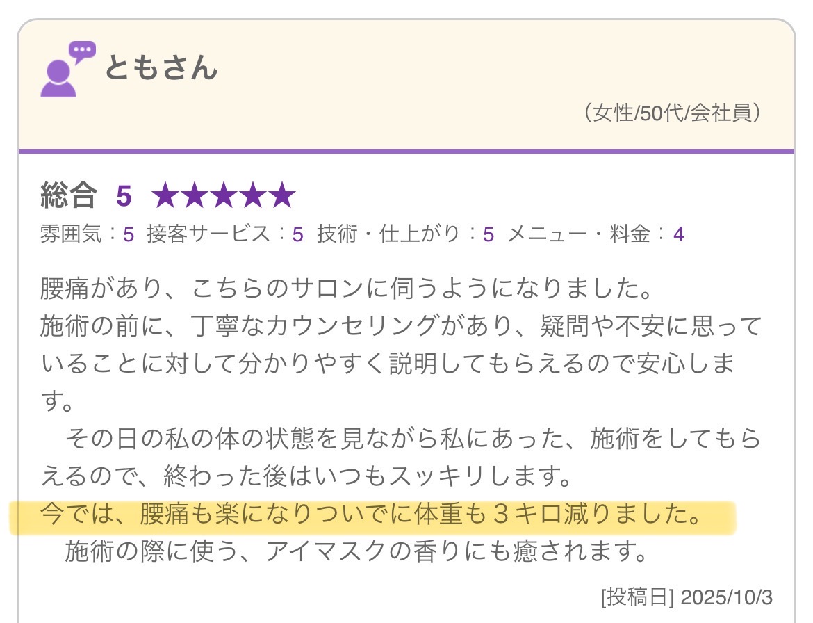 今まで整体やリンパマッサージに行ってきたけど何をやってもその場しのぎだった。