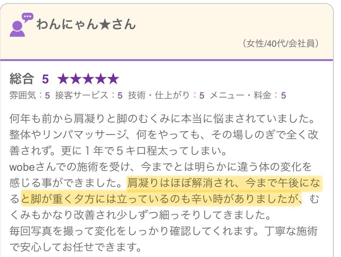 wobeに来てから肩こりはほぼ解消されて立っているのもツライ浮腫みが改善。