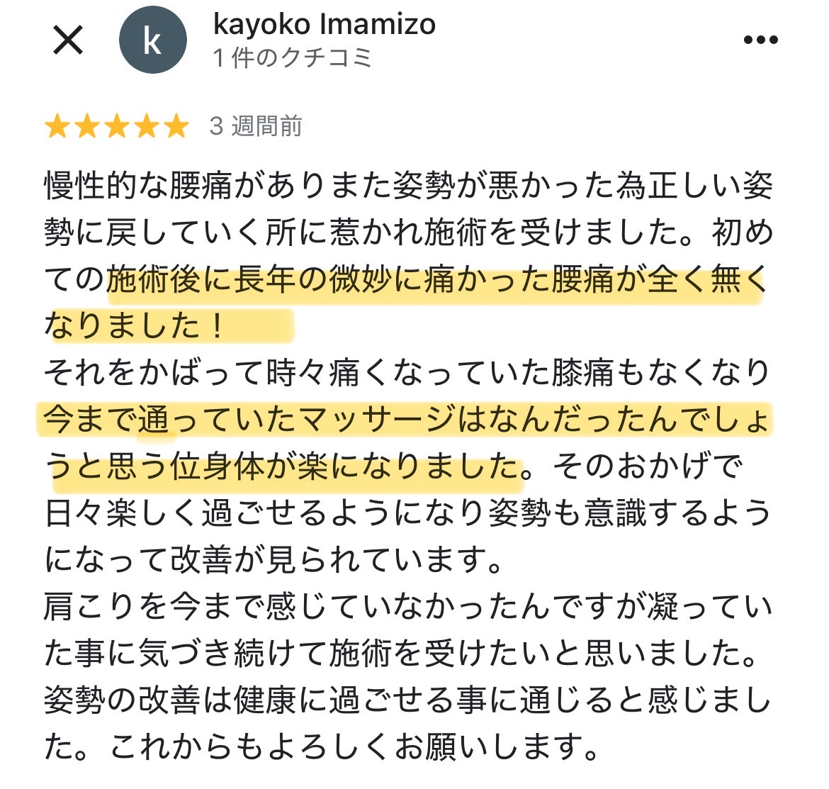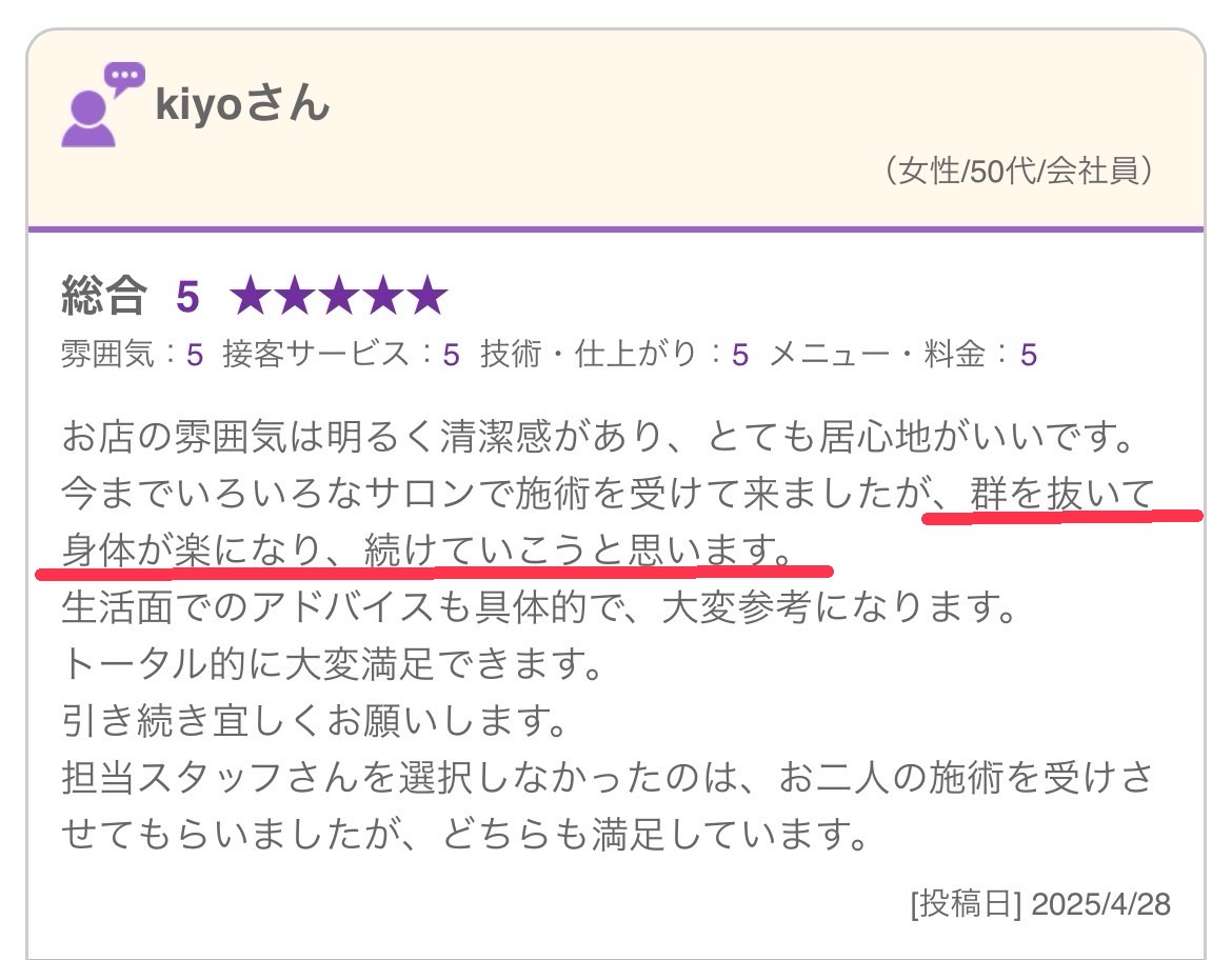 今まで通っていた施術は何だったんでしょうと思うほど楽に。